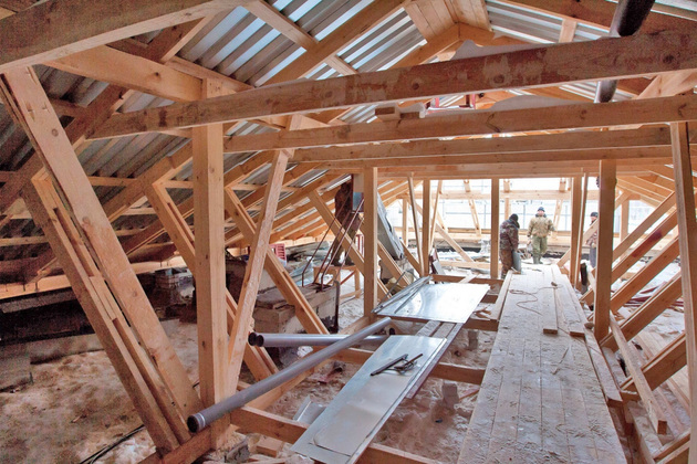 По округе разносится бодрый стук молотков. Кровельщики укрепляют стропила и формуют киянками кровельное железо. Осталось только закрыть торец, и объект будет готов к сдаче.