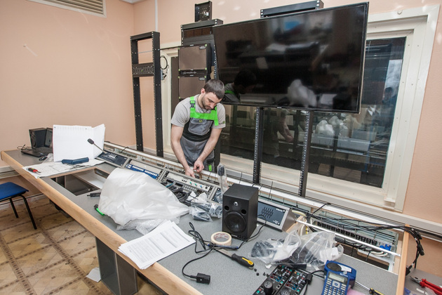 За панорамным окном, в соседнем помещении, разместится режиссер. Его пульт управления процессом впечатляет даже профанов и даже в незаконченном виде. Один джойстик для регулирования камер чего стоит! А еще экраны, аудиосвязь со студией и дистанционное управление светом.