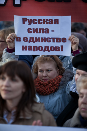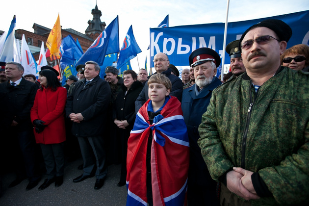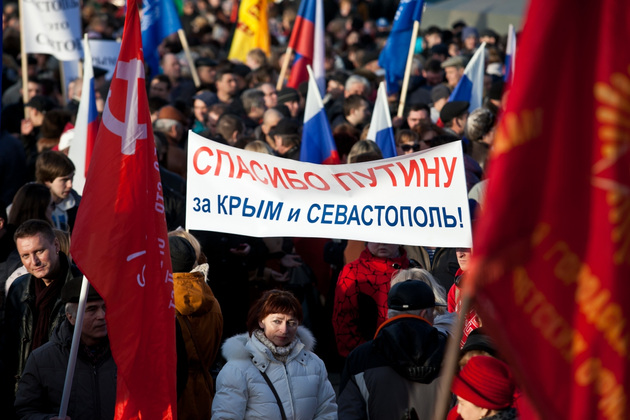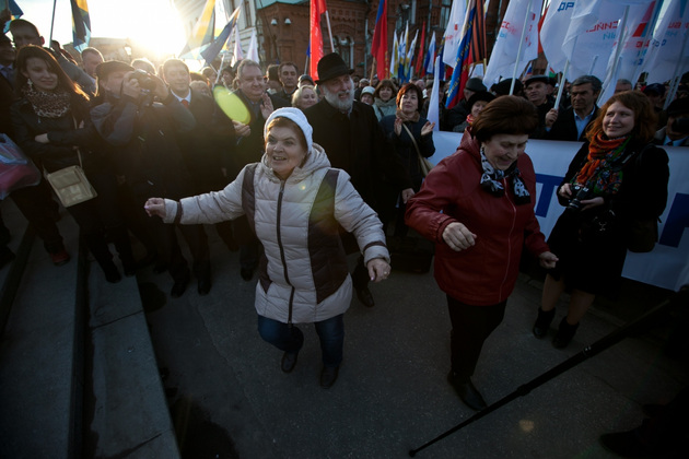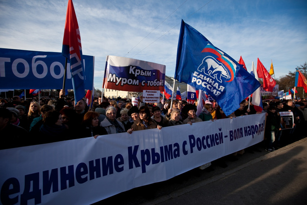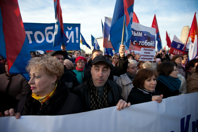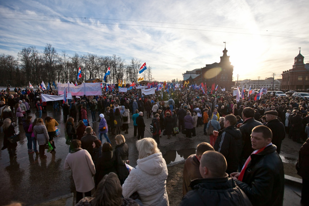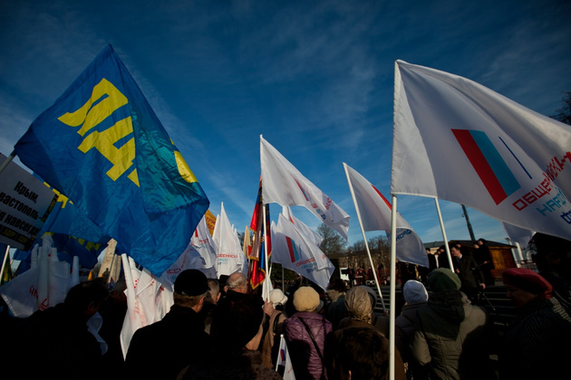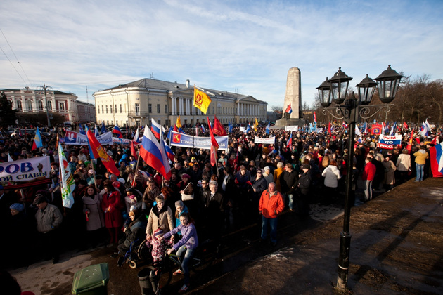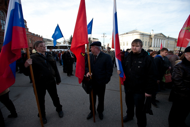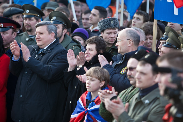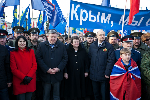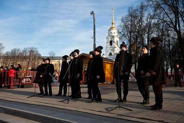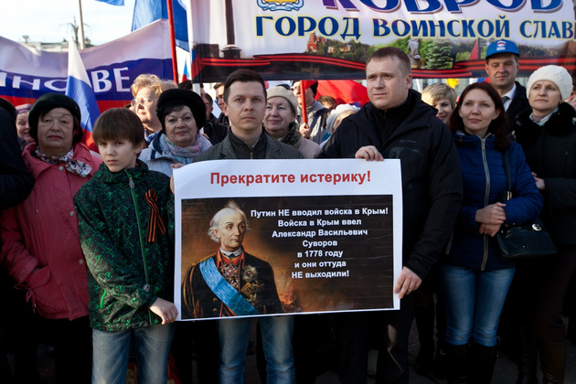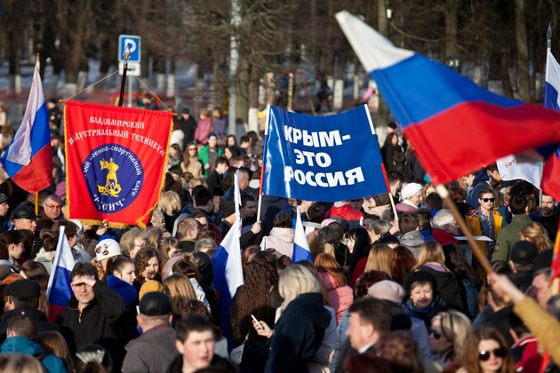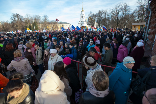 Вчера на Соборной площади Владимира было многолюдно. Повсюду праздничные флаги и транспаранты. На плакатах: «С возвращением домой, Крым!», «Крым, мы с тобой!» , «Крым, Севастополь - Россия навсегда!». Приветственные крики после слов ведущих: «Творится новая история. Народ сделал свой выбор. Мы празднуем годовщину воссоединения!»