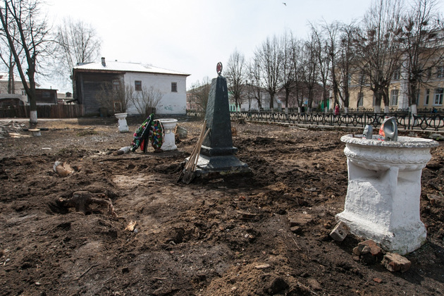 До памятника погибшим от ран оказалось всего метров пятьсот по пешеходной улице. Он стоит одиноко посреди перекопанного газона напротив старинного здания из красного кирпича. Выкрашенный черной нитрой с красной звездой наверху монумент старинного образца без табличек и надписей. Рядом обрубки деревьев, два венка и пять лопат. В первый момент картина озадачила. Но прохожие тут же посвятили в суть событий.