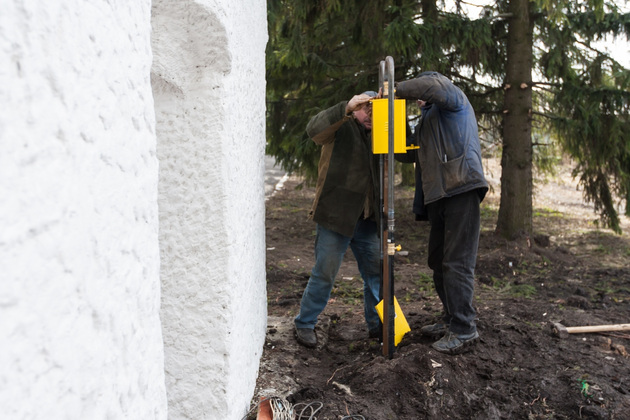 Вечный огонь здесь не просто не горит. Он сейчас закрыт сбитым из досок коробом, который по цвету сочетается с металлическими подставками для флагов. Дизайн немного смущает, но стоило нам заглянуть за монумент, все объяснилось. Как раз в день нашей поездки рабочие монтировали газовый счетчик. Они-то и рассказали нам, что к 70-летию Победы к Вечному огню провели газовую трубу.