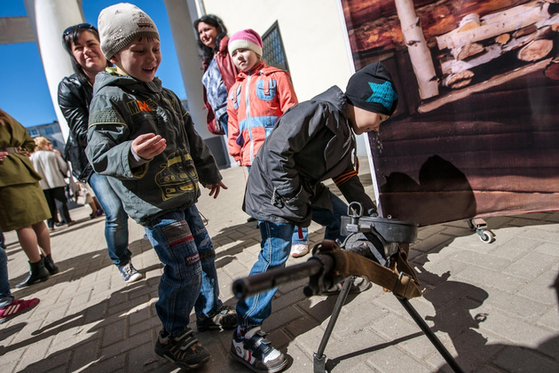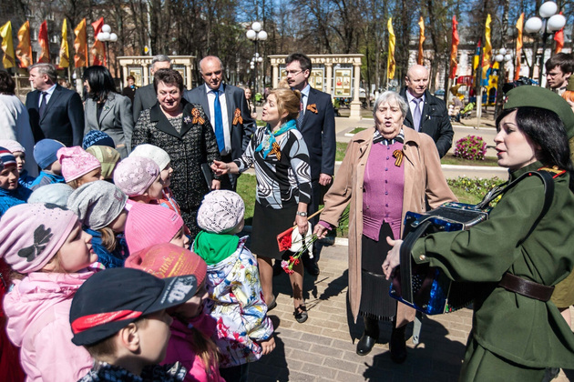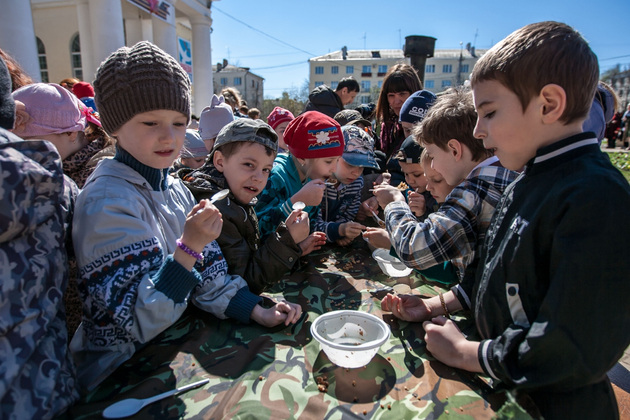 Набегавшиеся ребятишки с аппетитом уминали гречневую солдатскую кашу с тушенкой, приготовленную на военно-полевой кухне. Они забирались в грузовики времен войны - ЗИС-5 и «Студебекер». У фонтана развернулись интерактивные концертные площадки, где общались и, не стесняясь, пели военные песни люди разных поколений. Кстати, губернатор Светлана Орлова сама спела на площади «Катюшу» вместе с ребятишками одного из социально-реабилитационных центров.
