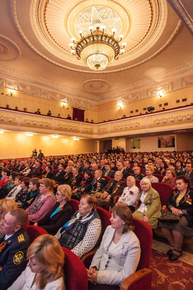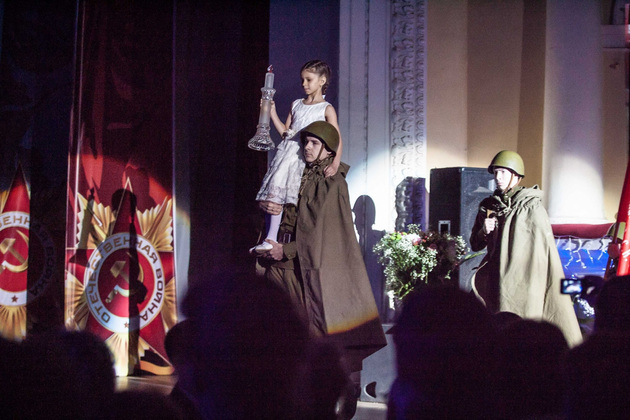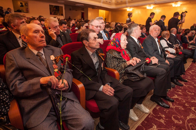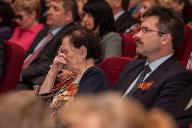 На сцену концертного зала молодые ребята вынесли символическую зажженную свечу, и все собравшиеся почтили павших на полях сражений минутой молчания. На экранах под мелодии военных лет мелькали фрагменты военной фотохроники, лица солдат и офицеров, от которых трудно было оторвать взгляд - одухотворенные, волевые, решительные, родные...