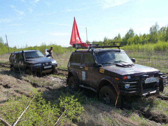 Ну а затем было настоящее внедорожное «трофи» по пути от шоссе к деревне Кострово. Дорога туда только проселочная через лес и поле. Тут потребовалось и мастерство вождения по ухабистой дороге с грязевыми участками, и готовность взять застрявшего товарища на буксир. Так что повезло увидеть клуб «4х4» в «родной стихии» - на бездорожье.