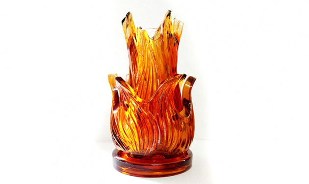 С волнением и трепетом пустилась я в неблизкий путь в город Гусь-Хрустальный, когда получила сообщение от Анны, что заказ готов. Что там получилось? На складе готовой продукции коробку распечатывала с нетерпением. И вот изделие на столе в собранном виде. Я зажигаю привезенную из дома свечу и вижу настоящее чудо. Янтарные языки хрустального пламени вспыхнули от пламени свечи, и чем ниже опускалось пламя, тем большее свечение охватывало всю композицию, пока она не засветилась вся. Мы с сыном не могли оторвать взгляда от этого рукотворного пламени. Перед нами был настоящий Вечный огонь.