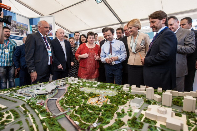 В первый день форума Владимирский шатер посетили вице-премьер Правительства РФ Аркадий Дворкович и губернатор Светлана Орлова. Андрей Шохин рассказал им, что областной центр представил на форум инвестиционные проекты, которые реализуются уже сегодня или запланированы на ближайшую перспективу. Это строительство Лыбедской магистрали, крупного спортивно-рекреационного центра с аквапарком на Дворянской, отеля Hilton, реконструкция «Патриарших садов», создание пешеходной зоны в историческом ядре города на Георгиевской и Девической, а также проект набережной Клязьмы.