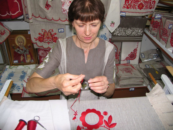 Когда видишь, как под иглой мастера льняное полотнище расцветает букетами, перестаешь воспринимать платья как обычную «шмотку». Рука сама тянется к кошельку - вот она, магия соучастия в творческом процессе. Тем более что и продавцы приветливы, готовы, как в давние времена коробейники, разложить в лучшем виде весь товар. Народ из нашей группы чуть было не затарился льняными платьишками с вышивкой от 1700 рублей и дороже. Но нужна примерка, а на нее времени не дают. Это тоже «косяк» создателей маршрута: хронометраж экскурсии должен учитывать и время на примерку.
