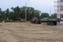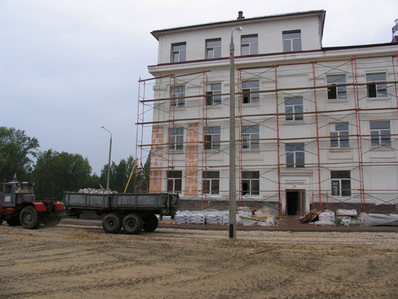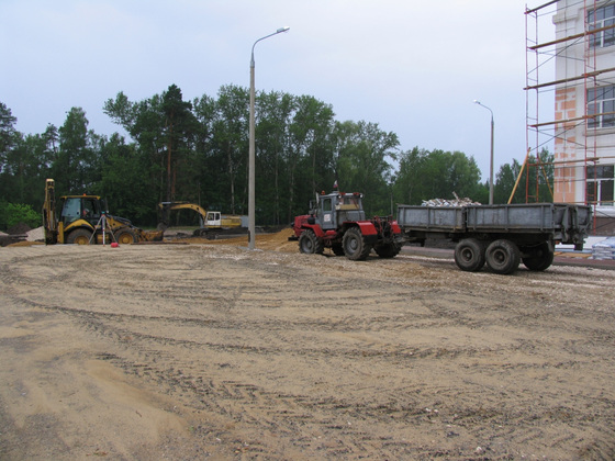 Одновременно с отделочными работами ведется и благоустройство территории. Уже уложен песок и щебень там, где будут подъезды к зданию.