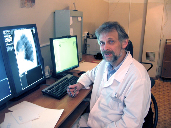 Заведующий отделением рентгенологии Евгений Юрьевич Решетников посвятил медицине 30 лет. В его рабочем кабинете - компьютер, на котором он рассматривает снимки, и как отдушина - шкаф с книгами и старыми фотографиями.