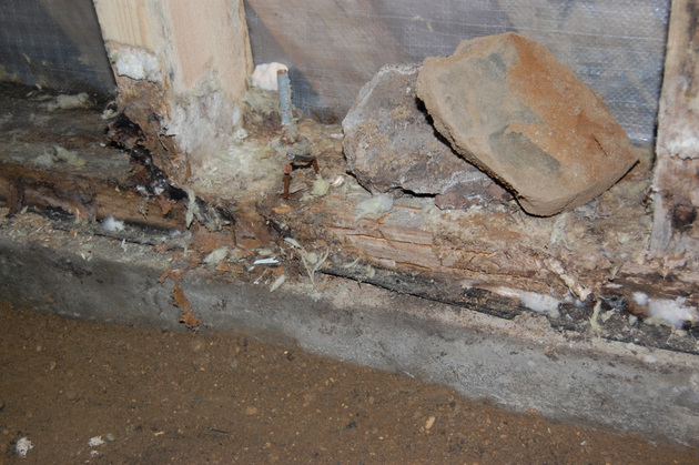 Когда вскрывали пол и внутреннюю обшивку стен, ужаснулись даже бывалые строители: нижние доски каркаса стен и лаги пола сгнили напрочь, плесень проникла даже в минераловатные листы теплоизоляции и пенопласт, которым был утеплен пол.