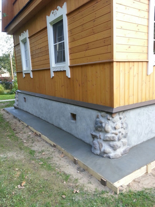 Существует несколько типов отмостки. Деревянные ушли в прошлое, сегодня самый популярный материал - бетон. Он технологичен, долговечен, надежен. Остальные варианты - тротуарная плитка, кирпич, булыжник - можно считать экзотикой, хотя и они «в строю». Иногда встречается и простейший вариант - «глиняный замок». Делается он просто. Снимается верхний слой грунта сантиметров на 25-30 в глубину, в траншею подсыпается и трамбуется слой песка. На него укладывается глина. Ее проливают водой и тоже трамбуют. Как говорится, дешево и сердито. Функцию свою такая отмостка выполняет исправно. Единственный минус: ходить по ней в дождь не рекомендуется.