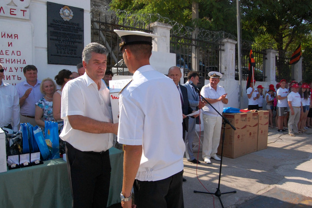 У причала, где пришвартован «Александровец», выстроена сводная команда всех пяти «наших» кораблей. Первый вице-губернатор Алексей Марченко от имени и по поручению губернатора Светланы Орловой вручает подарки и благодарственные письма командованию 68-й бригады и особо отличившимся морякам. Не с пустыми руками приехали и главы городов и районов ‑ владимирский градоначальник Андрей Шохин, ковровский мэр Анатолий Зотов, глава администрации Александровского района Игорь Першин и председатель Муромского Совета Константин Федурин. Дарят нужные в хозяйстве вещи ‑ хлебопечки, водонагреватели, микроволновки и прочую технику.