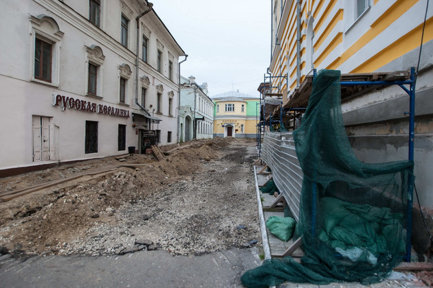 Работать остается меньше месяца, поэтому рабочих мы застали на площадке даже после 7 вечера. Трудятся вплоть до сумерек, чтобы все успеть. Самая тяжелая часть работы - по очистке территории - позади. Первым делом здесь вырубили уже почти сгнившие, по словам строителей, деревья, а также вывезли тонны мусора: 5 грузовых машин в течение 8 часов выгружали из исторического центра «культурный слой» 90-х. В настоящее время вырыты траншеи для прокладки кабеля. Новая пешеходная будет выложена плиточным покрытием и хорошо освещена. Около церкви оставят зеленые оазисы. Благоустроят и территорию на задворках Центра классической музыки. А справа от кузницы Бородиных будет организована смотровая площадка. К ней с основной выложенной новой плиткой мостовой будет вести небольшая лестница. Здесь открывается прекрасный вид на Успенский собор, парк Пушкина и клязьминские луга. Новая смотровая по задумке будет напоминать площадку на Спасском холме.