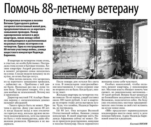 В прошлый четверг («ВВ» № 148 от 13 августа, посмотреть текст можно, например, здесь: http://www.vedom.ru/files/papers/0/5/13496.pdf) мы рассказали о беде, которая свалилась на голову жительницы поселка Вяткино Надежды Бариновой, пенсионерки, ветерана Великой Отечественной, узницы нацистских концлагерей. Из-за короткого замыкания проводки в ее квартире выгорела кухня. Огонь уничтожил не только внутреннюю отделку, но и мебель, и бытовую технику.