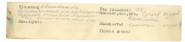 Согласно ОБД «Мемориал» Сергей Данилович Сучков служил в 71-й стрелковой дивизии, погиб под Ленинградом 15 января 1943 года, был похоронен в братской могиле. Останки его подняты 17 августа поисковиками Международного военно-исторического лагеря «Волховский фронт» на объекте «Рвы». 24 августа бойца перезахоронили с воинскими почестями на мемориале «Синявинские высоты». Поисковики разыскивают родственников героя. Если у вас есть информация о его семье, пожалуйста, сообщите в редакцию «ВВ» по телефону 32-02-69.