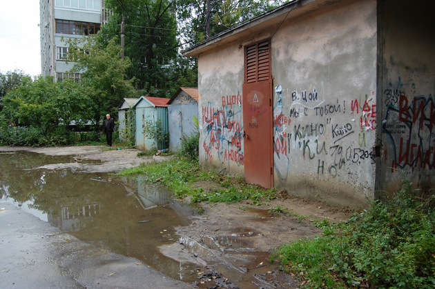 Но вот Солнечная, 54. Многоэтажки из силикатного кирпича сравнительно новой постройки. Двор укатан асфальтом нормального качества. Но въезд все равно зияет колдобинами. К слову, этот же двор удивил - в самом его центре цитаделью возвышается кольцо капитальных гаражей. Пара десятков, даже с отдельным двориком. Решение это рациональному осмыслению не поддается. Ясно, что места они занимают много, а толку от них мало. Почти весь двор - и так одна большая открытая парковка. Впрочем, наличие гаража для городского жителя в свое время было признанием статуса.