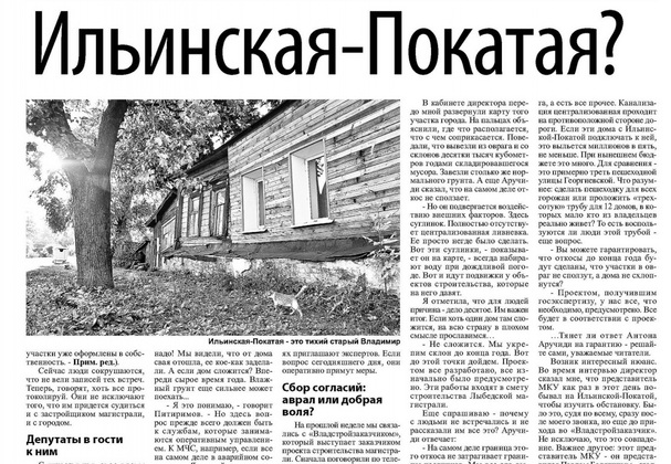 «Мы, жители нечетной стороны улицы Ильинская-Покатая, хотим поблагодарить сотрудников газеты «Владимирские ведомости» Марину Киселеву и Владимира Чучадеева, которые не остались безразличны к нашей проблеме, не отмахнулись, как все предыдущие инстанции, а на высоком профессиональном уровне помогли донести информацию до господина Аручиди (руководитель МКУ «Владстройзаказчик». - Прим. ред.). Директором МКУ «Владстройзаказчик» быть непросто, но возраст позволяет учиться, чтобы не платить штраф, как это было в случае за нарушение в сфере закупок в 2014 году. Нужно реагировать на обращения граждан, искать законодательно обоснованные решения для соблюдения интересов обеих сторон! Свою уверенность в ответе, что наши дома не разрушатся, - подкреплять фактами. Смету с данными по укреплению оврага нам не показали до сих пор...»