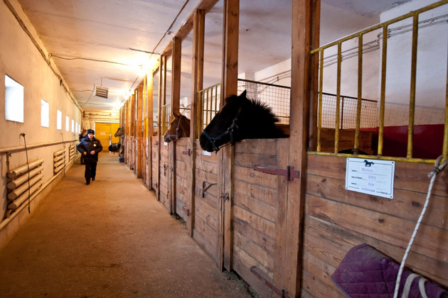 Для уборки денников и чистки лошадей специальных людей в полиции не держат. Уход за животными и их «квартирами» - это тоже обязанность кавалеристов. «На самом деле это правильно. Потому что если чистит лошадь один человек, а ездит на ней другой, то можно не увидеть, что с лошадью что-то не так ‑ допустим, нога зашиблена или еще что-то. И лошадь выйдет в патруль с больной ногой», - объясняет Владимир Косарев. В среднем по два часа в сутки тратят кавалеристы на уборку и уход за лошадьми. Видимо, поэтому в полицейской конюшне почти нет характерного для такого места «амбре» и реально чисто.