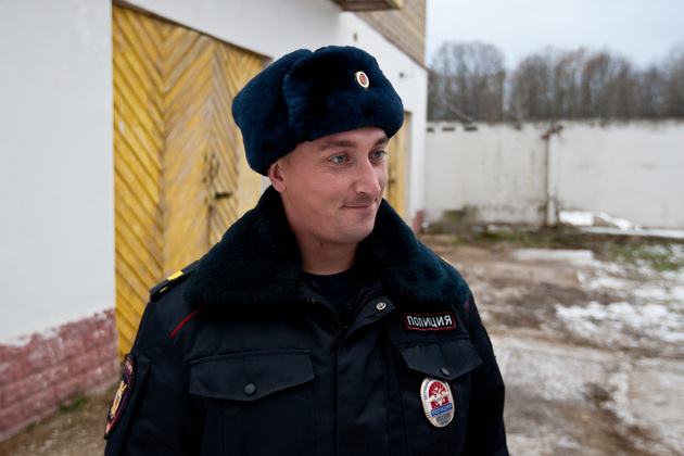 Нас встретили Владимир Косарев, заместитель командира батальона ППС УМВД по городу Владимиру, и Николай Рогов, командир кавалерийского отделения. Рядом с командиром - охраняющая конюшню овчарка. Чужакам она явно не обрадовалась.