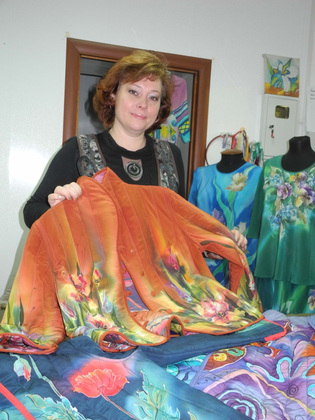 - Мы же для людей и делаем. Поэтому и технологии у нас такие, чтобы вещь в использовании удобной и практичной была. После росписи ткань проходит специальную обработку для закрепления красок. Краски используем только натуральные. Затем выполаскиваем до чистой воды. Носите на радость. Это же здорово, когда вещь радует своего владельца, поднимает настроение всем, с кем он на улице встретится. Мы сами позитивные и хотим, чтобы вокруг позитива больше становилось, - смеется руководитель мастерской.