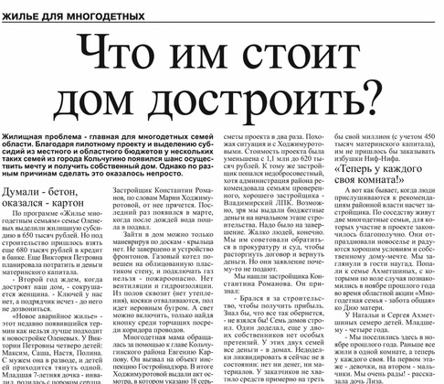Именно в Кольчугинском районе реализуется проект строительства домов для многодетных семей. Для этого выделяются субсидии из областного и районного бюджетов (до 1/3 от общей сметы строительства). Оказалось, дело это напоминает лотерею. У кого-то все благополучно: попался добросовестный застройщик, хватило собственных денег, чтобы добавить к бюджетным средствам. К примеру, семья Ахметшиных уже отпраздновала новоселье и счастливо живет в своем собственном доме.