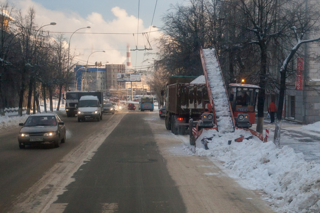 ...Прошли сутки после воскресной метели. В городе продолжают разгребать сугробы. Вслед за 28 КДМ на дороги выходят шесть грейдеров, сдвигающих отвалы с обочин на дорогу. Пять лаповых погрузчиков отправляют снежную массу в самосвалы, путь которых лежит на снежную свалку в Михайловский овраг, где это все будет таять до июля. Только в воскресенье, 10 января, из города было вывезено 6250 тонн снега, подсчитал главный инженер ЦУГД Антон Фомин.