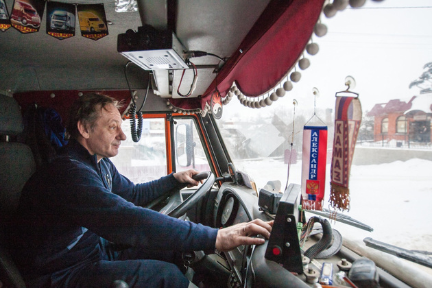 Сворачиваем с «пекинки» на оргтрудовскую дорогу. Александр Коваль вылезает из теплой кабины на мороз ‑ отрегулировать «вертушку», разбрасывающую песок. Это приходится делать вручную. А вот пульт управления навесным оборудованием ‑ в кабине «КАМАЗа». Запускается механизм нажатием одной кнопки. Компьютер, кстати, показывает и температуру за бортом. Сегодня минус 23. Только тронулись ‑ стоп, машина! Пропускаем легковые автомобили. Александр ‑ водитель вежливый и необычайно терпеливый. На узкой дороге не можем разъехаться с легковушкой. За рулем ‑ девушка. Ждем, пока она медленно то сдает назад, то дергает вперед. Александр улучает момент и виртуозно проводит свою махину в трех сантиметрах от седана испуганной водительницы.