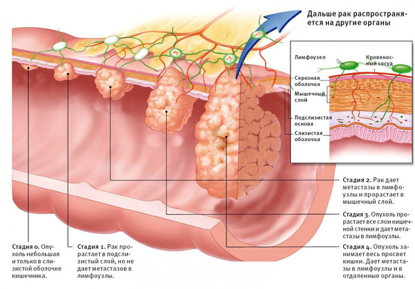 - Со спазмами и болями в области живота, особенно в левой его части. С хроническими запорами. С беспричинными на первый взгляд температурой и потерей веса. С болями при дефекации. Ну и главное - с кишечными кровотечениями. В этом случае к врачу надо даже не идти, а уже бежать. Кровотечение требует немедленного обследования. Но даже без ощутимых симптомов я бы рекомендовал всем раз в год проходить обследование толстой кишки. Этот рак не так быстр в метастазировании и не так агрессивен, как рак желудка или легких, он обычно развивается в течение долгого времени. Поэтому если хотя бы раз в год делать обследование, можно фактически (процентов на 90) обезопасить себя от этого вида рака. Некоторые стесняются обращаться к врачам с проблемами такого рода, но это совершенно неразумно. Стесняться тут нечего. А сделать колоноскопию или сдать анализ кала на скрытую кровь можно практически в каждой поликлинике.