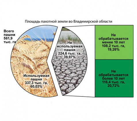 Площадь земель сельскохозяйственного назначения во Владимирской области составляет 985,8 тыс. га. Непосредственно пашня занимает 561,9 тыс. га, многолетние насаждения - 19,8 тыс. га, сенокосы - 120,3 тыс. га, пастбища - 118,2 тыс. га, залежь - 38,0 тыс. га. Большая часть площадей находится в ведении крупных организаций. Директор департамента сельского хозяйства и продовольствия АВО Евгений Вишневский сообщил, что 85 процентов земель СПК и других сельхозорганизаций используются по назначению. Фермеры тоже на высоте: 70 процентов земель крестьянско-фермерских хозяйств обрабатывают. А вот из земли, находящейся в личном пользовании граждан, засеивают лишь на 15-16 процентов, и это самая проблемная категория.