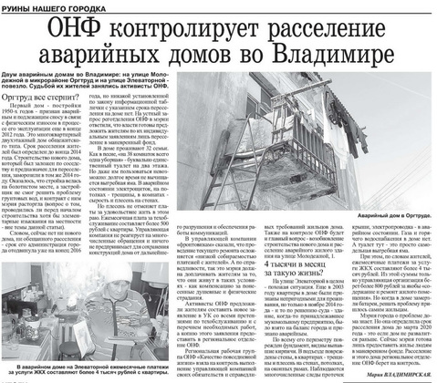 Этот многоквартирный дом находится в управлении МКП Владимира «ЖКХ». В 2014 году его признали аварийным (76 процентов износа) и подлежащим сносу. Был установлен срок отселения граждан - до 1 марта 2020 года. МКП «ЖКХ» предписано обеспечить безопасные условия проживания граждан на период до расселения дома.