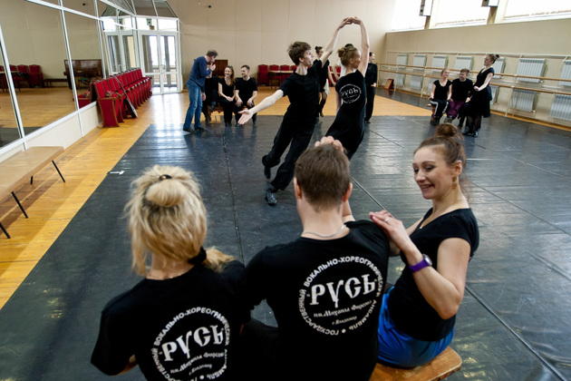 Рождается феерия в большом репетиционном зале филармонии, похожем на школьный спортзал. Танцоры ‑ все в черном трико с лого «Руси» - стоят кружком, выслушивают рекомендации репетитора по балету Елены Ахметовой. Идеально прямые осанки, красивые одухотворенные лица, энергичная пластика...