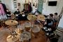 Музыкальная комнатка «Руси» сплошь заставлена инструментами. Гитары. Ударная установка. Клавишные. Свирели. Гармони. На столиках ‑ губные гармошки, дудочки, рожки и масса других мелких инструментов, которые я даже опознать не берусь. Занимаются три человека. Каждый отыгрывает свое, и все вместе выдают непередаваемую какофонию. Это вотчина музыкального руководителя «Руси» Игоря Носова. Его мы отвлекли от работы над записью. Он подтверждает: каждый музыкант в ансамбле фактически человек-оркестр. Игорь и сам играет на баяне, гармони, на окарине и ударных.