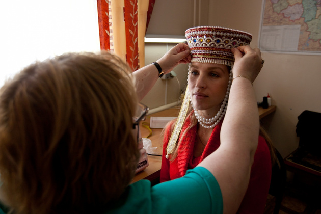 Когда мы появились в костюмерной, тут как раз шла примерка нового головного убора для одной из танцовщиц. Костюмы шьют индивидуально под каждого артиста. Естественно, дизайн придумывается под замысел худрука на каждую программу. А всего сейчас у «Руси» восемь действующих концертных программ. Вот и прикиньте объем работ...