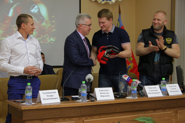 Состоялся обмен подарками. Картухин вручил каждому единоборцу боксерскую перчатку из гусевского хрусталя. Поветкин подарил Картухину настоящие боксерские перчатки с автографами всех трех мастеров.