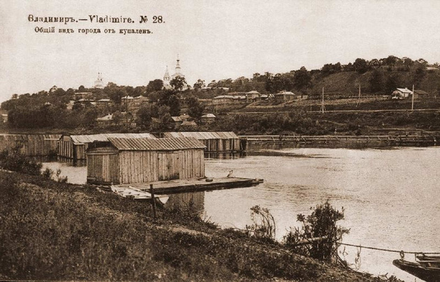 Первоначально общественные купальни располагались рядом с дровяными складами на правом берегу Клязьмы. Чтобы добраться до них, надо было перейти мост. Это несколько отдаляло их от города, но зато там была вода чище и попасть в купальни можно было по Муромской улице: и пешком, и на извозчике.