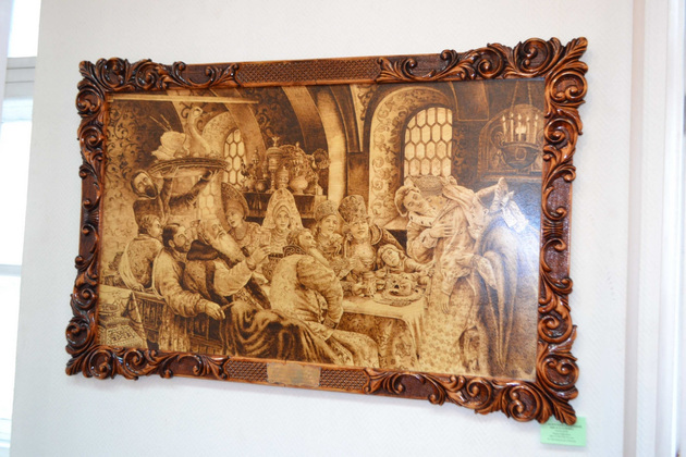 Но на этот раз первое место на всероссийском конкурсе принесла своему автору крупная картина в необычной и трудной технике пирографии «Боярский свадебный пир в XVII веке». Ее выполнил Борис Народов из колонии № 6 Оренбургской области.
