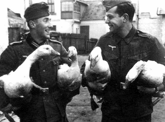 Из фильмов о войне в сознании многих сложилась картинка поведения германской армии: в деревню въезжает мотоциклетный патруль или передовой отряд немцев на бронетранспортерах и начинается... «Бабка, яйки, млеко, курка!» - кричат немцы, ловят свиней и гусей и тут же их жарят и едят. Молоко и самогон льются по губам веселых и наглых (пока еще) солдат...