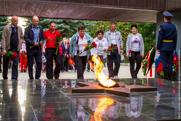 В ранний час у Вечного огня собрались ветераны Великой Отечественной, труженики тыла, руководство региона во главе с губернатором Светланой Орловой, председатель ЗС Владимир Киселев и его заместитель Ольга Хохлова, руководство города Владимира, ГФИ Сергей Мамеев, представители ветеранских и молодежных организаций области и даже делегация из города-побратима Эрлангена (Германия).