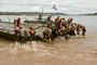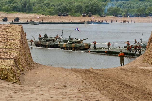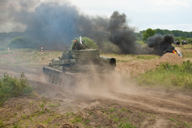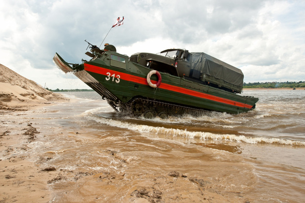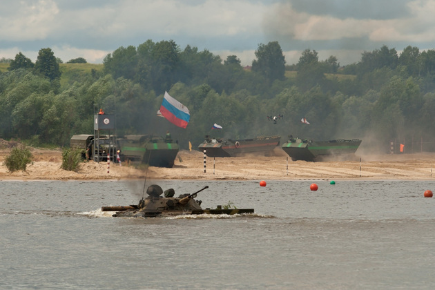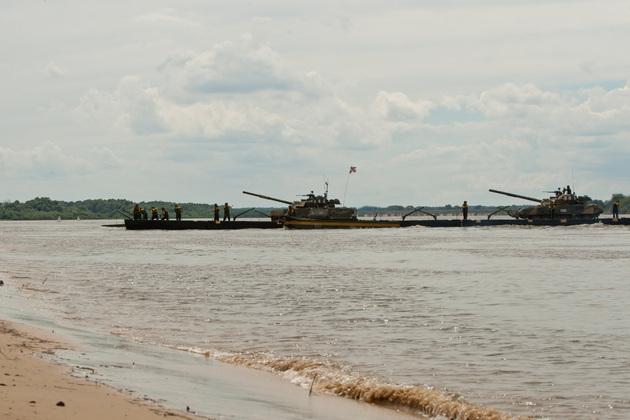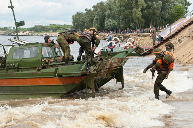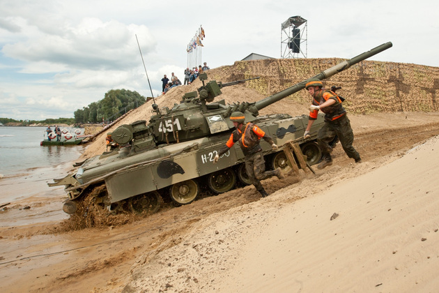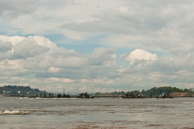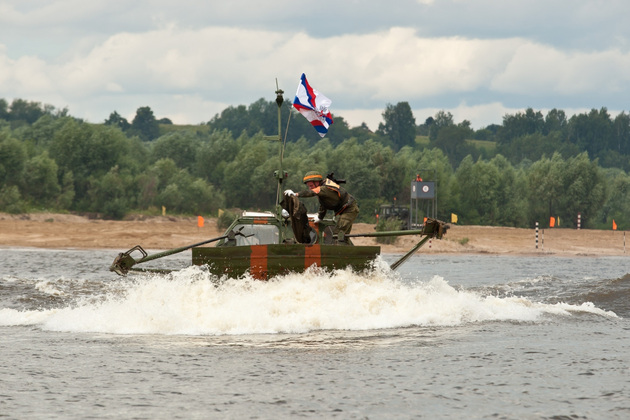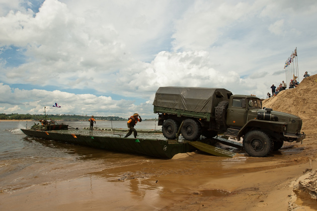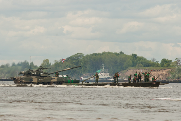 И вот все три понтонные роты после торжественного открытия начали финальную переправу. Эстафета была построена по принципу: чем дальше, тем больше и труднее. Команды начали с разведки на надувных лодках, а завершали переправой нескольких танков на огромных взводных паромах, и проделали это дважды. Надо было доплыть до другого берега, «выкатить» с понтона технику в свой «створ», заранее прорытый на противоположном берегу, и вернуть пустой паром обратно. Сделать все это надо было с наименьшим количеством ошибок.