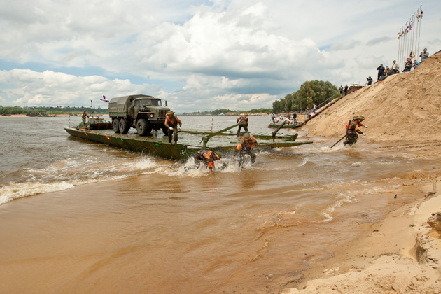 В каждой команде - до 100 человек (рота) и до 30 единиц техники, не считая многочисленной «обслуги» команды. В отборочных соревнованиях, которые проходили с июня на полигоне под Муромом, участвовало девять понтонных частей со всей страны. В финал вышли три роты, но, естественно, муромляне "болели" за своих – за базирующуюся в городе 45-ю отдельную инженерную бригаду ЗВО. Эта команда победила на прошлых российских и международных соревнованиях и считалась фаворитом.