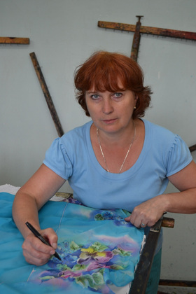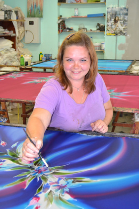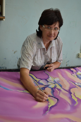 Здесь оказываешься как будто одновременно в дизайн-студии высокой моды и мастерской художника. На манекенах - наряды в разной степени готовности. Вот кроит уже расписную ткань модельер-закройщик Ирина Горбунова, виртуозно действуя ножницами. Часть помещения мастерской занимают большие пяльцы, на которых растянуты шелковые ткани. И художники по ткани Елена Голубцова, Татьяна Шаврина, Алла Васильева, Маргарита Петрова, Галина Серебрянская часами кропотливо расписывают шелк неповторимыми узорами, орнаментами или пейзажами. Выбор сюжета и цветовой гаммы рисунка всегда идет от желания заказчика. Готовится большая серия эскизов и начинается поэтапная роспись. В конце трудоемкого процесса на каждом завершенном рисунке каждый мастер ставит свой автограф, чтобы заказчик был уверен ‑ это эксклюзивное произведение, которое создаст неповторимый стиль в одежде.