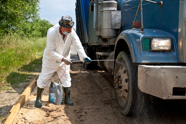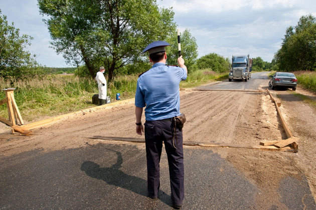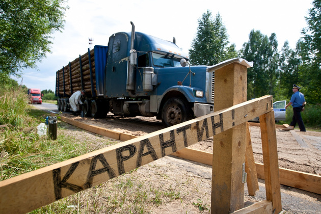 На въезде (точнее, на выезде из зоны) ‑ карантинный пост. Участок дороги засыпан опилками, пропитанными дезраствором. Вахту у дезбарьера круглосуточно несут ветврач и сотрудник полиции. Работают посменно, по 12 часов. Полицейский досматривает машины на предмет вывоза туш, консервов или кормов, а ветврач обрабатывает колеса транспорта дезраствором из пульверизатора.