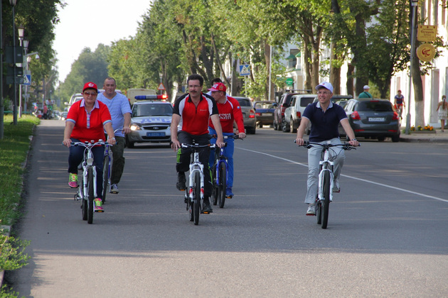 Из Добрынского Орлова отправилась в Суздаль. Там она, Ревенко и глава администрации города Сергей Сахаров проехали по городу на велосипедах.