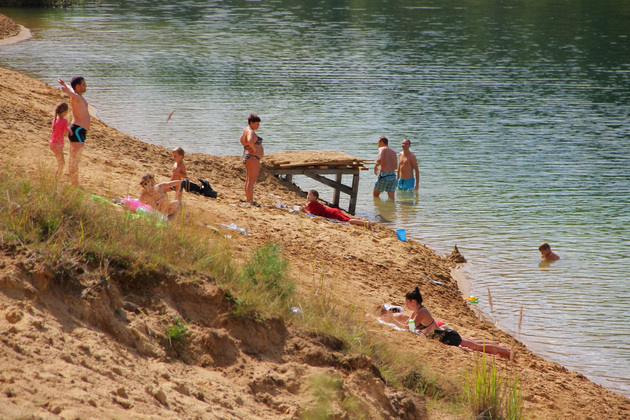 Остановка номер два - Улыбышевские карьеры. Здесь даже во «внеурочное» время, в разгар рабочего дня, уже отдыхают несколько десятков человек. Это неофициальный пляж. Выглядит хорошо ‑ мягкий песок, на вид более или менее чистая вода. Хотя резкий обрыв на большую глубину виден даже с берега: светлая полоса обрывается почти черной водой. Не зря детям родители велят плескаться только на отмели. А вот подростки спокойно играют в мяч на плаву.