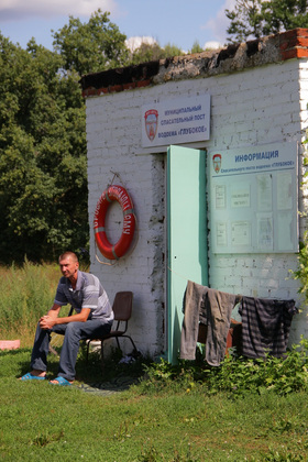 Явный плюс этого конкретного пляжа на Глубоком ‑ работающий спасательный пост. Вахту там на момент нашего визита нес мужчина по имени Роман. Он показал нам имеющееся спасательное оборудование (от лодки до кругов и мегафона) и даже то самое постановление Роспотребнадзора на стенде. А еще сказал, что в выходные на этот пляж набивается человек по 150. Но несчастных случаев, тьфу-тьфу, не было.