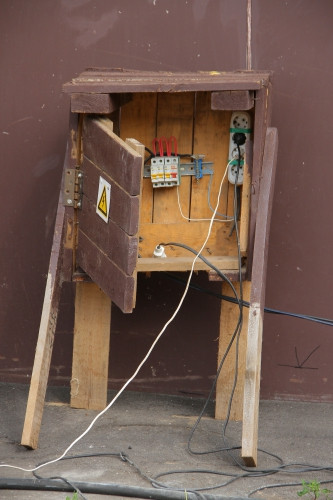 Объект введен в эксплуатацию, но электроподстанцию еще не построили. ВОЭК согласился «запитать» дома по временной схеме (чтобы люди хотя бы смогли начать делать ремонт в квартирах) от строительной электроустановки. От деревянного щитка по всему двору в квартиры тянутся провода...