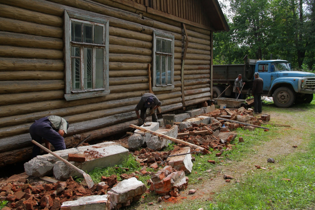 Обо всем этом нам рассказал Анатолий Мишуткин. Его бригада как раз занималась заменой фундамента в корпусе начальной школы. Заменяли и нижние венцы сруба, сгнившие почти до трухи.