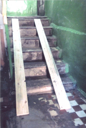 Я - инвалид-колясочник I группы. Уже несколько лет я борюсь с нашей больницей, с областью, с отделом архитектуры, с управляющей компанией, с депутатом. Мне обязательно необходим свежий воздух. Я проживаю на первом этаже. Ура! Но подъезд пандусом не оборудован. На мою просьбу установить пандус управляющая компания ответила: «Отдадим документы в отдел архитектуры». В течение 30 дней мне никто не ответил, а мне важен каждый день. Потом архитектура ответила - она вообще не слышала о подобных проблемах. На повторное обращение в УК «УЮТ» ее генеральный директор Селезнев ответил, что мне надо купить квартиру в новостройке, которая оборудована пандусом. Он только забыл выделить мне денег на эту квартиру и нанять круглосуточного помощника. Я абсолютно одинокий человек. При обращении к депутату Демидову, что такой бардак дальше продолжаться не может, он выделил мне две доски. Вот такой роскошный получился пандус.