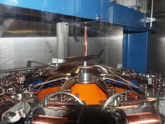 В июле две вертикальные оплеточные машины - 24-шпульная и 16-шпульная (шпулька - катушка для намотки проволоки. - Прим. авт.) были введены в эксплуатацию в цехе № 4. Они оснащены интегрированным лентообмотчиком, который позволяет одновременно проводить три операции: протягивать продольную ленту под оплетку, оплетать и обматывать кабель лентой. Обе машины предназначены для оплетки кабеля диаметром до 25 мм и до 14 мм.