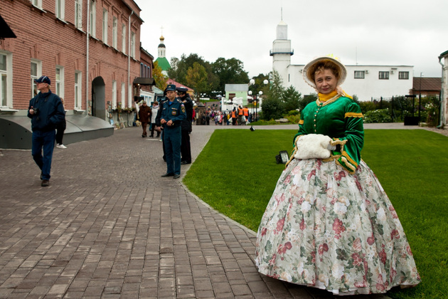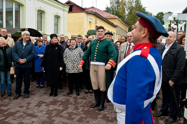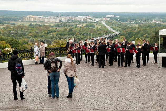 Организаторы открытия «пешеходки» в День города позаботились о достойном экскурсионном антураже: гостей у Спасского холма встречал говорливый «городничий», по всему периметру Георгиевской прогуливались коробейники и парочки, наряженные в сюртуки с цилиндрами и пышные платья с шелковыми зонтиками (это были артисты из ГДК и колледжа культуры, а наряды для них предоставил академический театр драмы), а на смотровой площадке душевно играл духовой оркестр из музыкальной школы Ставрова, самому маленькому музыканту которого исполнилось всего семь лет.